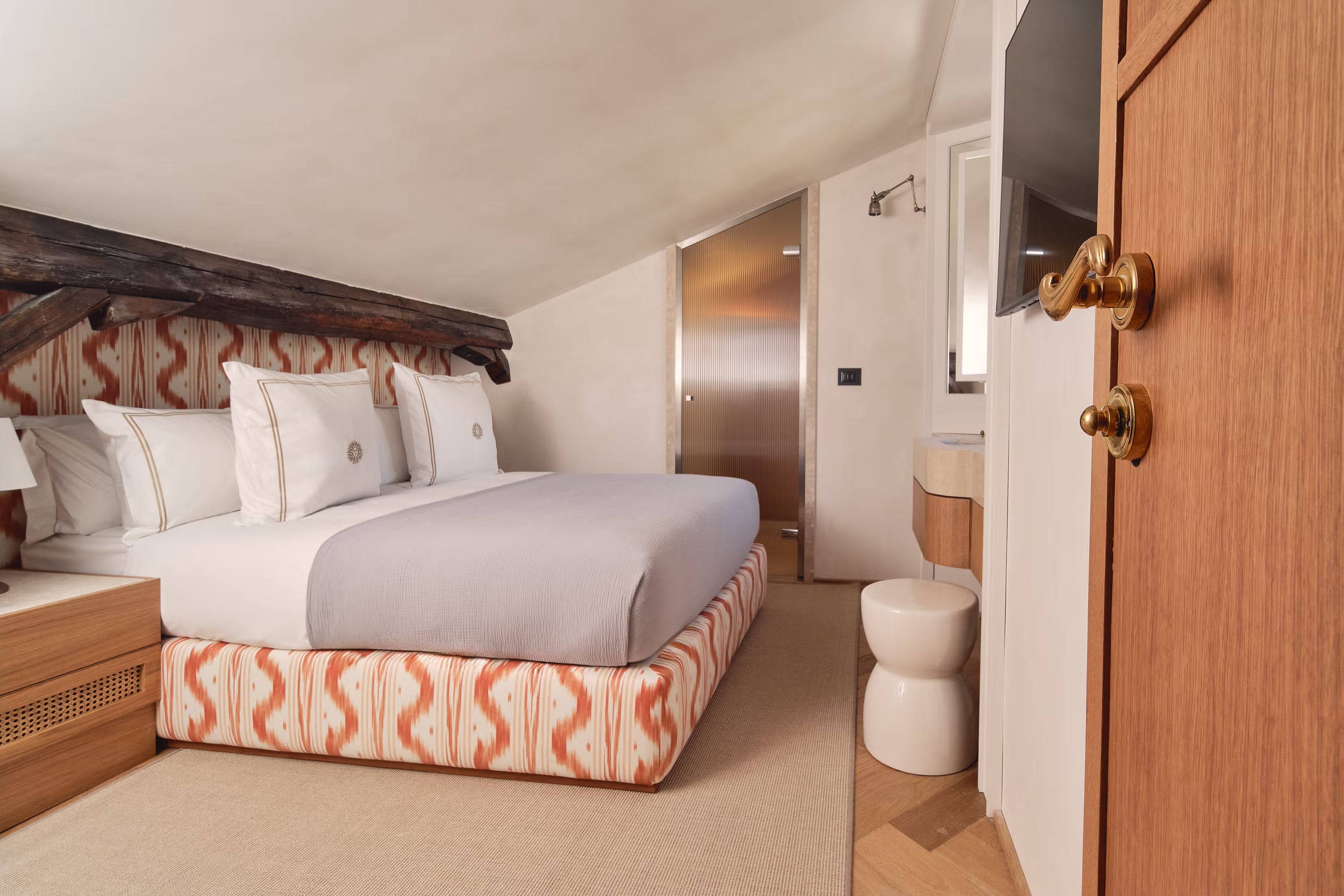 With sloping ceilings bathed in extraordinary natural light, it offers a refined environment where Dedar fabrics and marble converse with subtle classical and contemporary inspirations. The two bedrooms ensure peace and comfort, while the windows, opening onto stunning views, frame the breathtaking vista of the Spanish Steps of Trinità dei Monti, turning even the simplest daily gestures into a scenic experience.